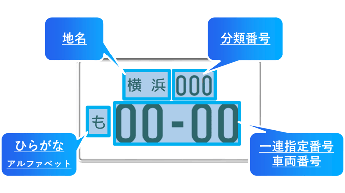 例:「品川 330 さ 1234」の場合、品川=登録地、330=普通乗用、あ=自家用、1234=固有番号となります。